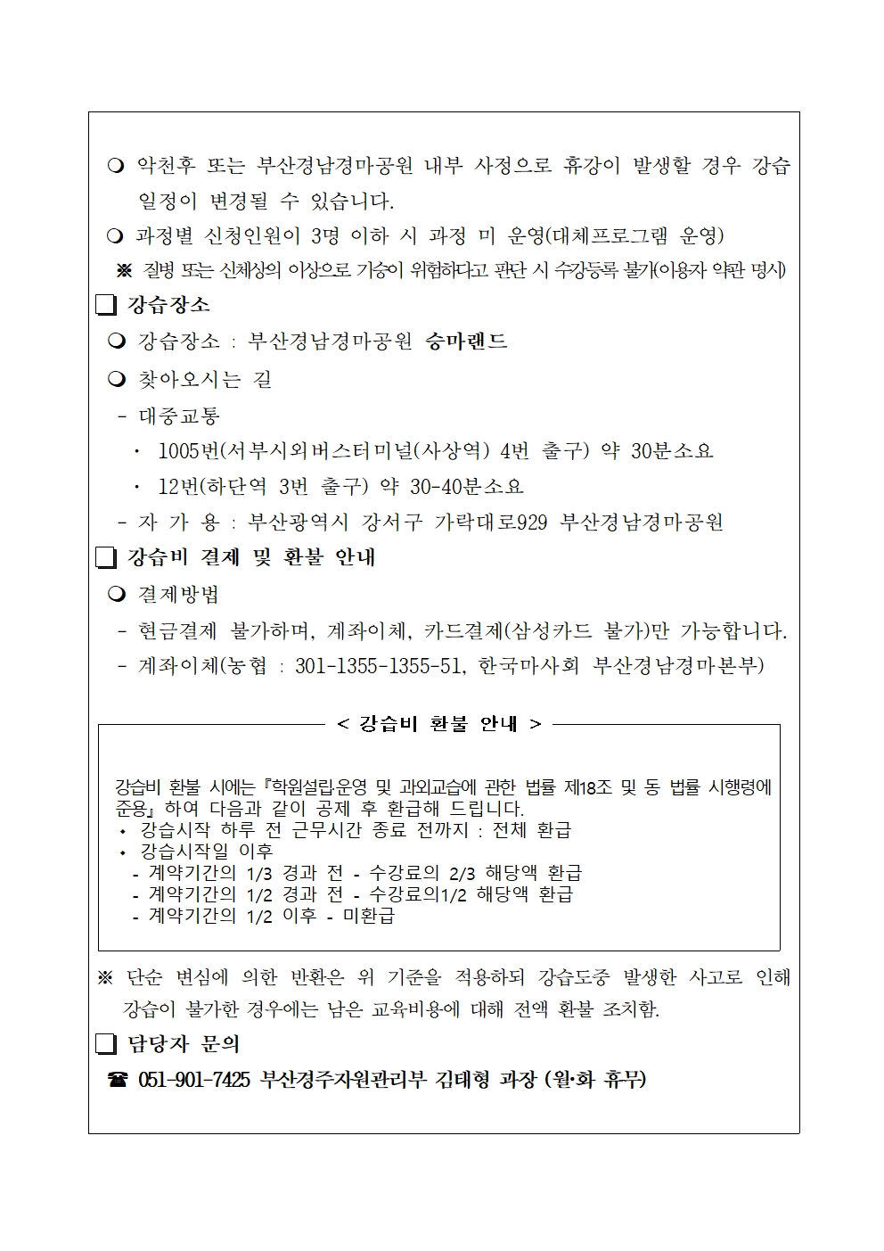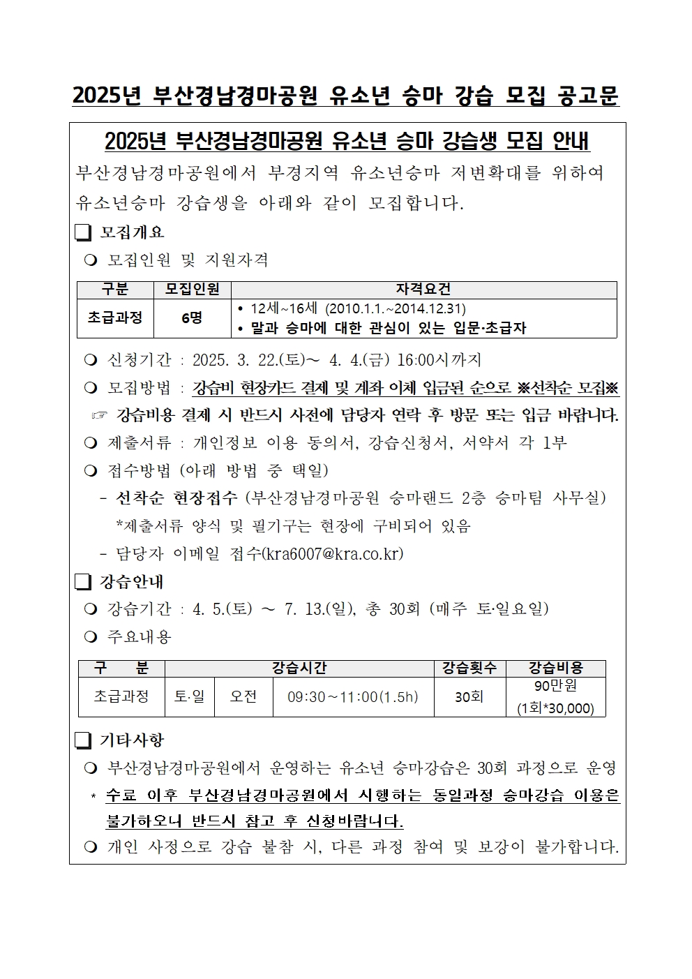 제목 2025년 부산경마공원 유소년 승마 강습생 모집 안내