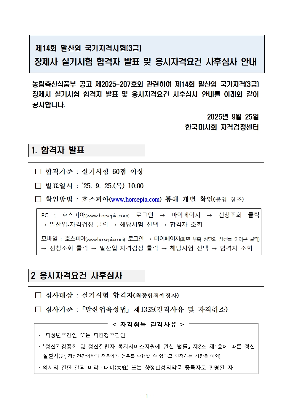 제목 제14회 말산업 국가자격(3급) 장제사 실기시험 합격자 발표 및 응시자격요건 사후심사 안내