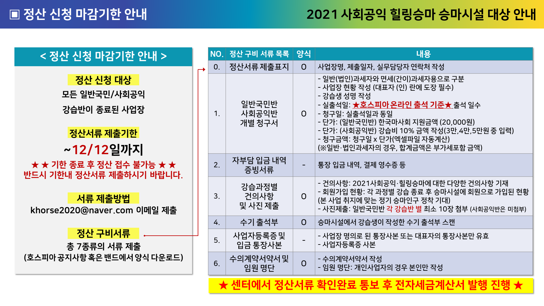 제목 (승마시설)사회공익 힐링승마 정산 마감기한 안내