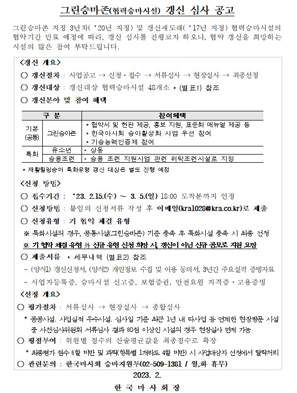 제목 2023년 한국마사회 지정 그린승마존(협력승마시설) 갱신 심사 공고