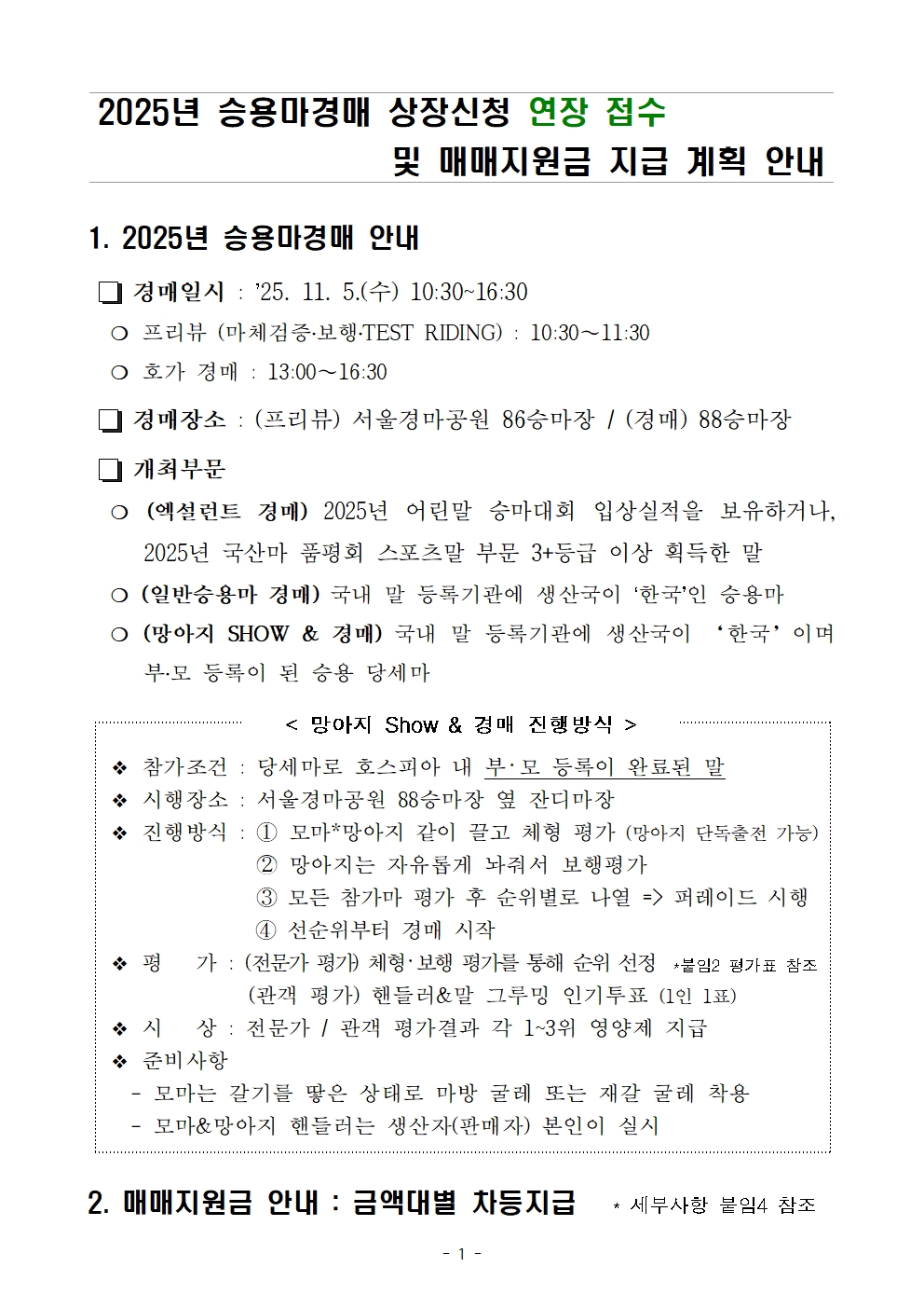 제목 2025년 승용마 경매 상장신청 연장접수 안내